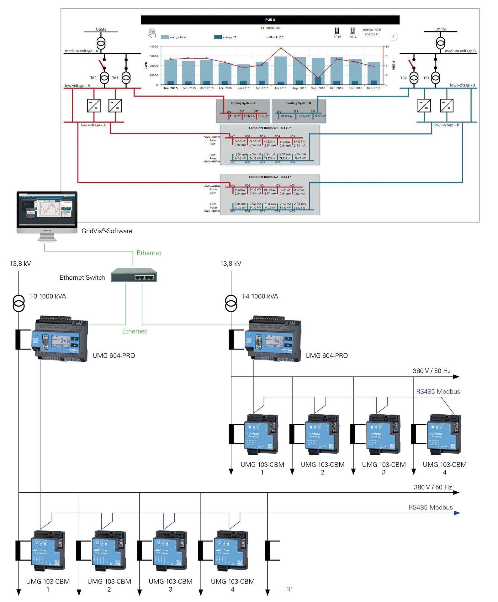 El UMG 103-CBM es una solución ideal para la adquisición de datos de medición en el nivel más cercano a las instalaciones. En combinación con dispositivos maestros como el UMG 604E o el UMG 96RM-E y el software GridVis®, se pueden crear soluciones escalables. Todos los datos se almacenan de manera centralizada en una base de datos y se pueden analizar mediante GridVis®.